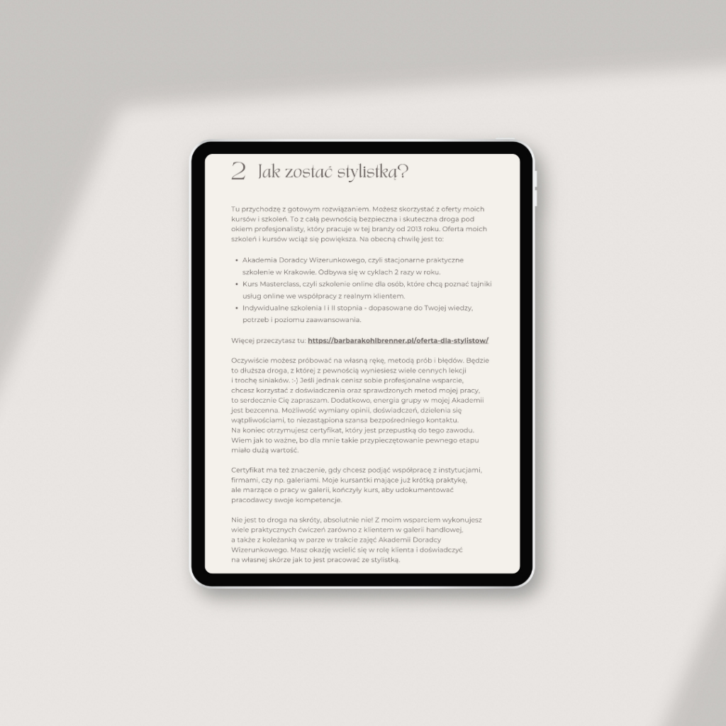 E-book ten oferuje praktyczne porady na temat stawiania pierwszych kroków w zawodzie stylisty oraz poszerzania swoich kompetencji.